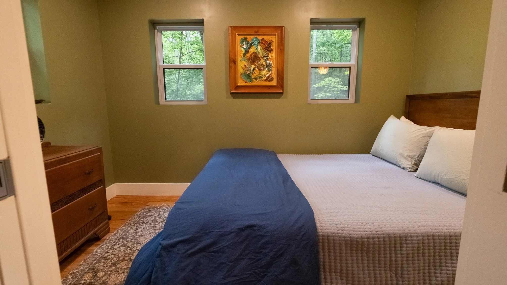 Cozy, colorfully-appointed, and nestled at the forest’s edge. One private queen room downstairs adjacent to the kitchen / living area and an upstairs platform with 3 single beds per cabin – perfect for intimate groups seeking privacy amid nature.